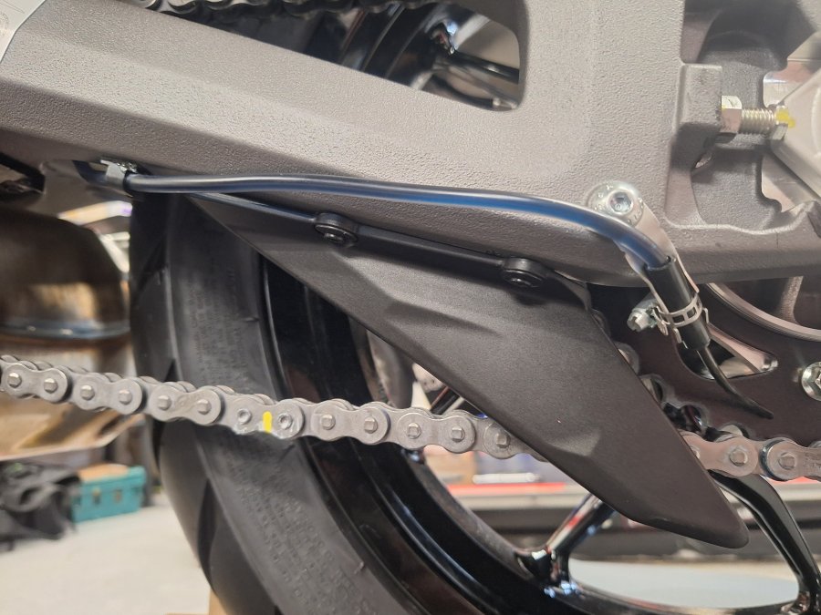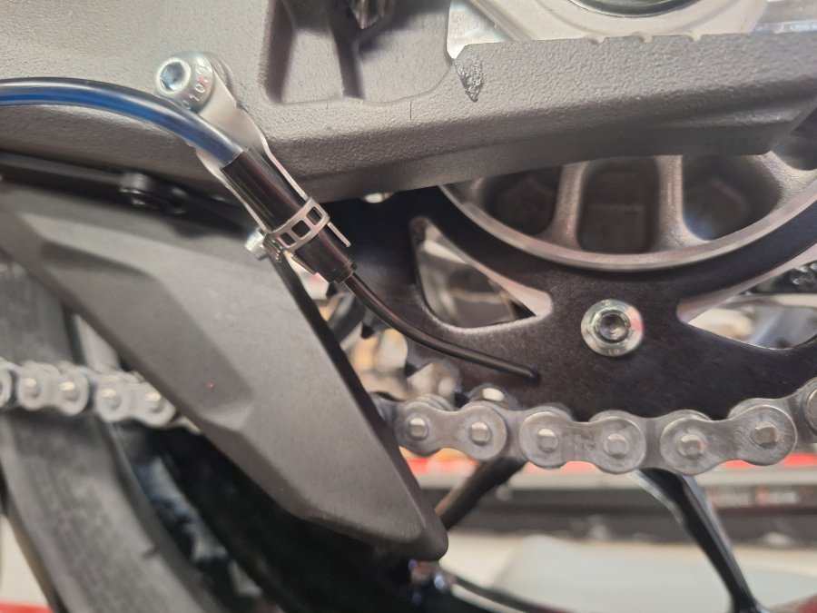 Tubing routed behind the swinging arm away from the hot exhaust and rear wheel.