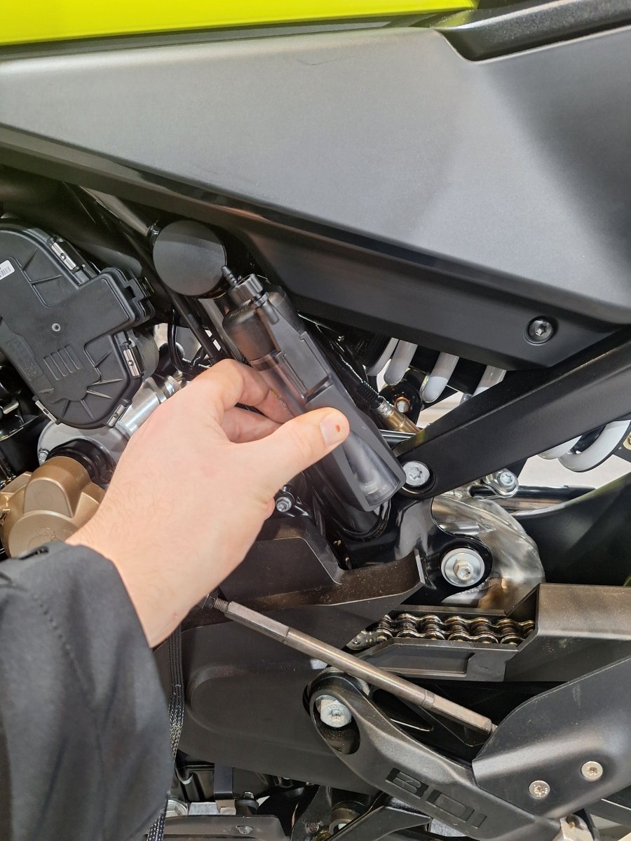 The first step is to find the vacuum connection on your bike. This could be an already existing and blanked off vacuum spigot, a vacuum blanking screw, a vacuum operated fuel tap or a balancing pipe between your cylinders. Motorbikes after 2016 also have an EVAP System to control the emissions. This is operated by the engine vacuum and you can connect into the vacuum line between the throttle bodies and purge valve. Once you have identified your vacuum source connect it with the vacuum damper elbow and black vacuum line to your Scottoiler.