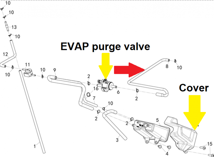The first step is to find the vacuum connection on your bike. This could be an already existing and blanked off vacuum spigot, a vacuum blanking screw, a vacuum operated fuel tap or a balancing pipe between your cylinders. Motorbikes after 2016 also have an EVAP System to control the emissions. This is operated by the engine vacuum and you can connect into the vacuum line between the throttle bodies and purge valve. Once you have identified your vacuum source connect it with the vacuum damper elbow and black vacuum line to your Scottoiler.