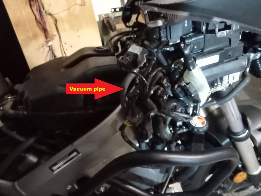 There is a vacuum pipe from the throttle bodies leading to a check valve. Cut this pipe and insert the 4mm Tee connector and push the vacuum damper onto the third leg of the tee.